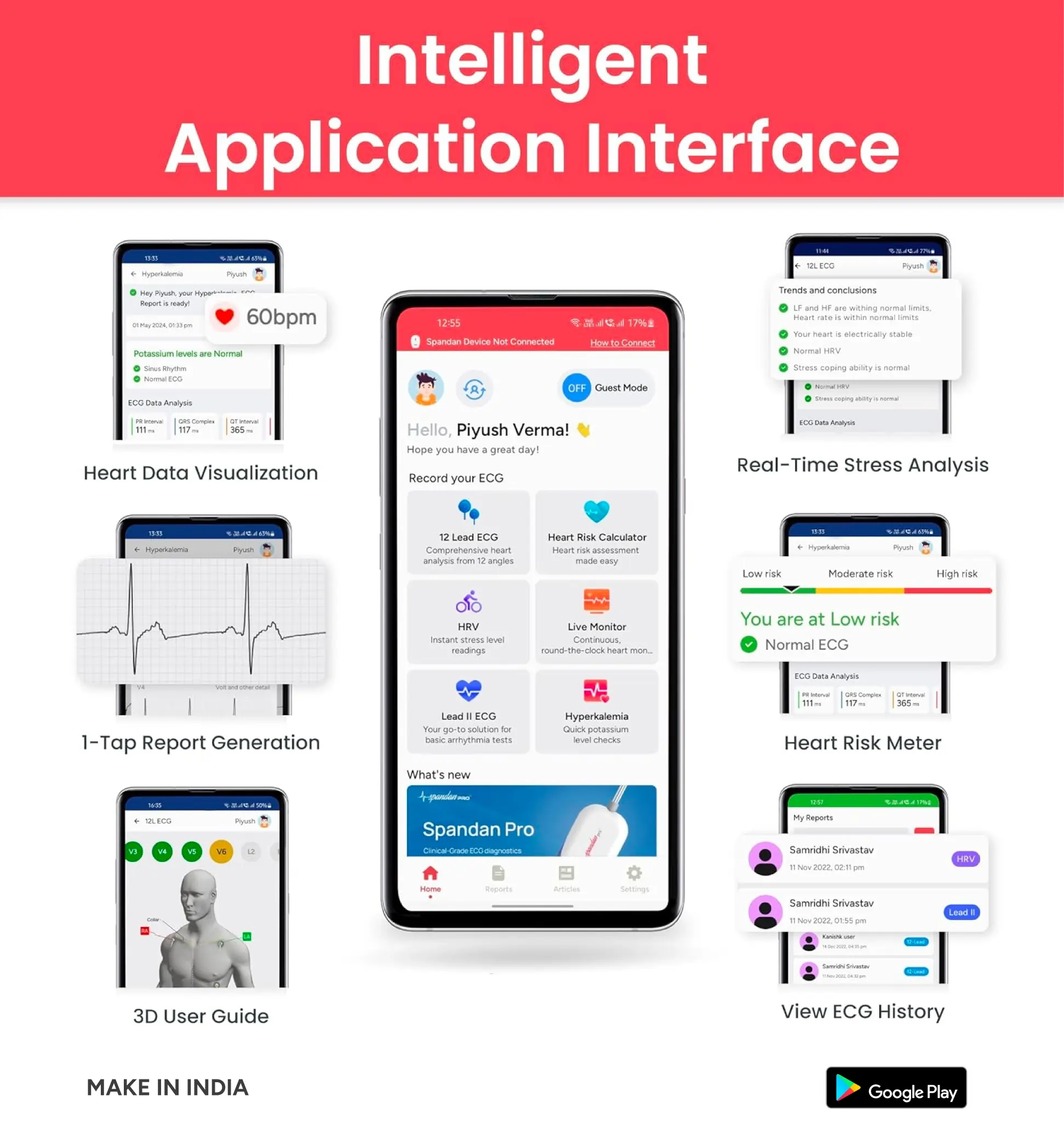 Spandan 4.0 can perform 12-Lead for detecting blockages , Lead 2 to detect arrhythmia, Live monitoring for real-time heart monitoring, and Heart Rate Variability Test (HRV) to assess heart rate, stress levels, anxiety.